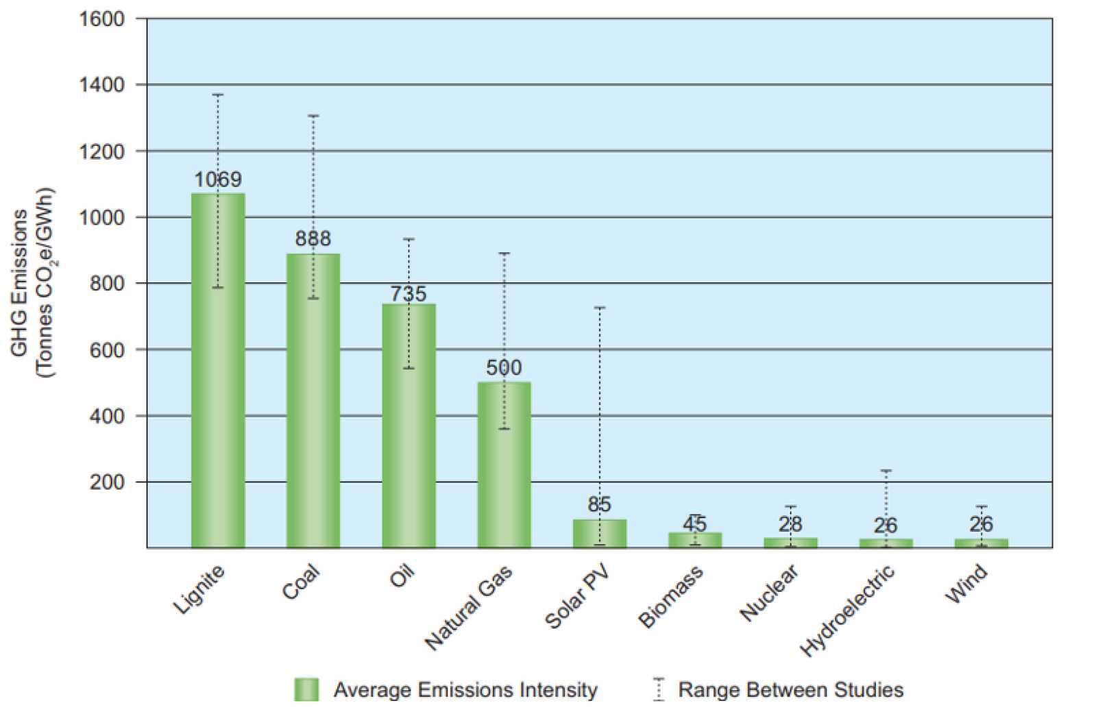 Figure 3 measures the GHG emissions for different electricity production technologies, including coal, natural gas, and nuclear energy. It shows the results of a study completed by the World Nuclear Association based on 21 independent studies. The range of emission values is due to the diversity of assumptions in the studies regarding processes used to mine or recover raw fuel materials. What’s important to take away here is that nuclear energy is one of the cleanest forms of electricity generation, with only hydroelectric and wind being cleaner. Given the intermittency of wind and our concerns with our water levels, nuclear is the best option for a deep decarbonization of electricity generation.