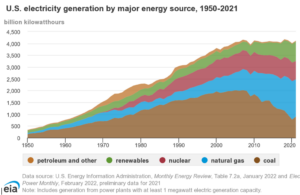 While natural gas supplanted coal in the US in 2016, coal remains the number one electricity-producing fuel globally (Figure 1). The reduction in coal usage between 2012 and 2021 is largely due to decreased use in the US because of intentional steps taken to produce cleaner sources of electricity (other large countries have actually increased their number of coal power plants during that timeframe).
